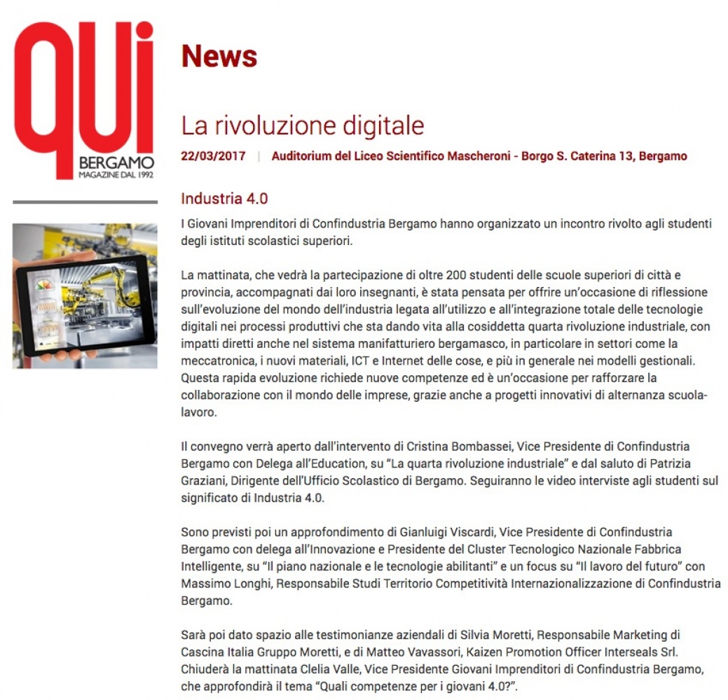 La mattinata, che vedrà la partecipazione di oltre 200 studenti delle scuole superiori di città e provincia, accompagnati dai loro insegnanti, è stata pensata per offrire un’occasione di riflessione sull’evoluzione del mondo dell’industria legata all’utilizzo e all’integrazione totale delle tecnologie digitali nei processi produttivi che sta dando vita alla cosiddetta quarta rivoluzione industriale, con impatti diretti anche nel sistema manifatturiero bergamasco.