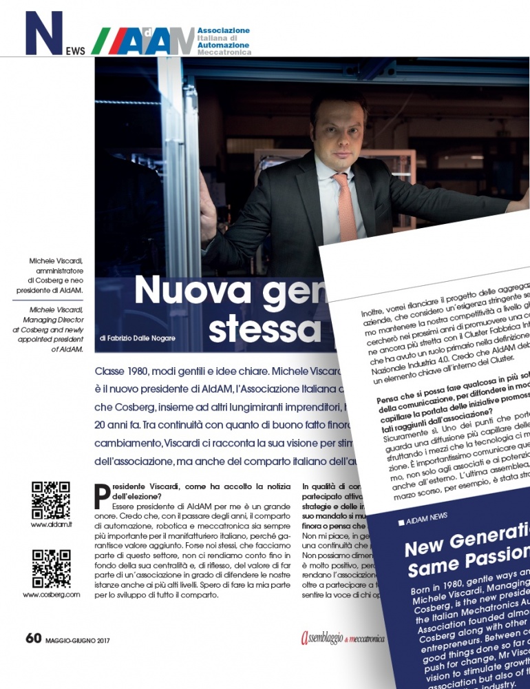 Sulla Rivista SdA (Soluzioni di Assemblaggio e Meccatronica) è apparso un articolo dedicato alla recente elezione di Michele Viscardi a Presidente AIdAM, dal quale emergono la visione e le intenzioni di Michele relativamente al suo nuovo ruolo. Ma, leggendo tra le righe, emerge anche il suo pensiero imprenditoriale e i suoi obiettivi aziendali.